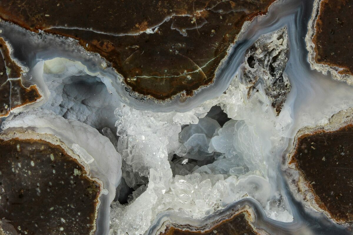 Agate is a variety of microcrystalline quartz (chalcedony) that displays translucence and, in some cases, banding. Agate primarily forms when silica-rich fluids fill pockets within rocks and/or fossils, depositing the silica along the walls of the rock. This process can result in banding patterns, as the compositions and impurities of these depositing fluids change over time. These banding patterns can either form as flat layers, creating linear patterns known as waterline agate, or as rounded layers, forming more common ring-like patterns. These patterns depend on the surfaces available for deposition.