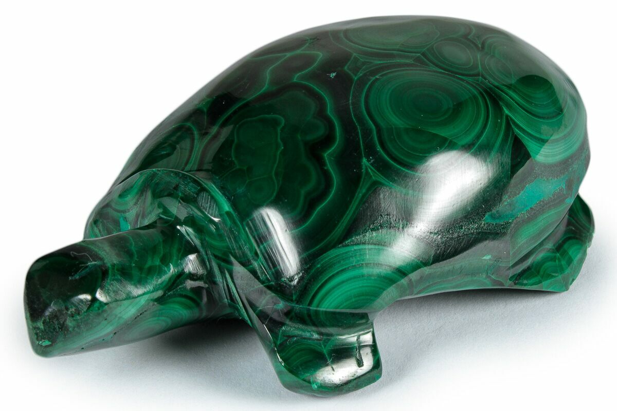 Swimming out of the ocean and crawling up your beach is this nicely carved turtle made from malachite collected from the Democratic Republic of the Congo. This is a sturdy, miniature piece that highlights the beauty of malachite with a nice, even polish. From rough mineral to polished piece, the malachite was worked by an expert craftsman to produce this statue reptile ready for display on the shelf or in the office.
