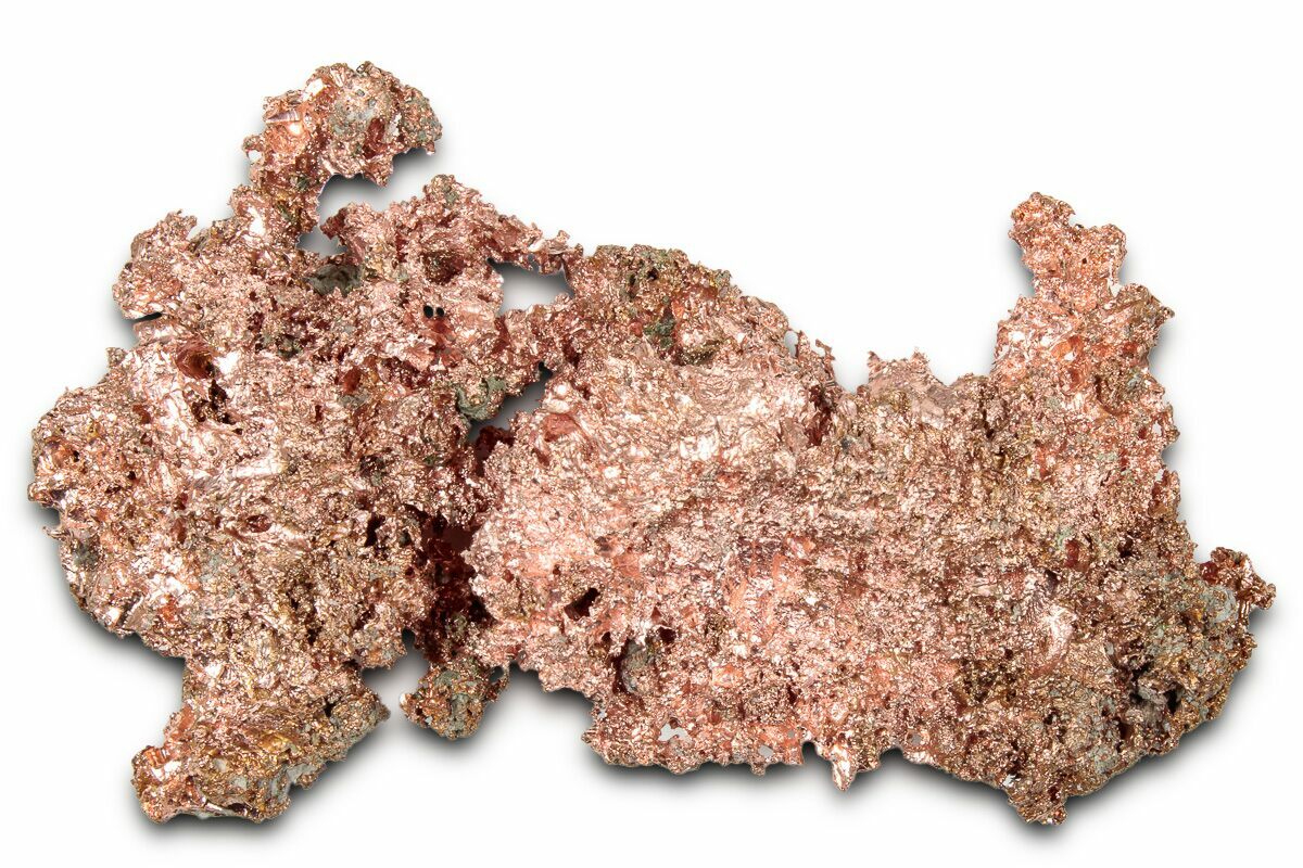 Native copper occurs rarely as isometric cubic and octahedral crystals, but more typically as irregular masses and fracture fillings. It has a reddish, orangish, and/or brownish color on fresh surfaces, but typically is weathered and coated with a green tarnish of copper carbonate.