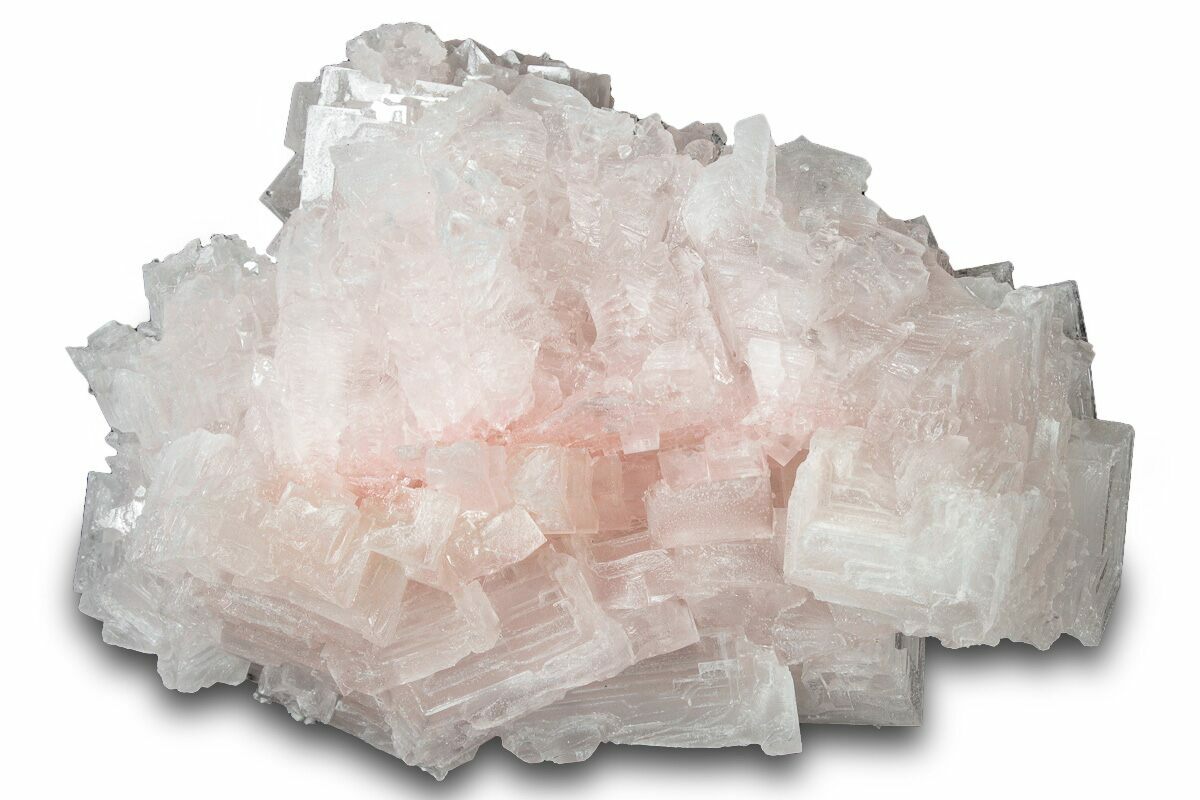 Halite crystals from Trona, California are prized for their striking cubic formations and delicate pastel colors. Formed in the arid environment of Searles Lake, these crystals develop as brine-rich waters evaporate, leaving behind layers of salt and other evaporite minerals. The halite here often exhibits a translucent to transparent quality with hues ranging from soft pink and lavender to pale orange, depending on mineral impurities and lighting conditions. Some specimens display a skeletal or "hopper" crystal growth, where the edges of the cubes grow faster than the centers, creating intricate, hollowed patterns. Due to their solubility in water, Trona halite crystals must be carefully stored to preserve their natural beauty. These ephemeral, geometric wonders are a favorite among mineral collectors for their unique desert origin and delicate charm.