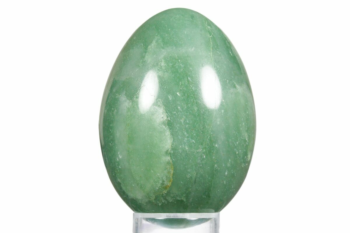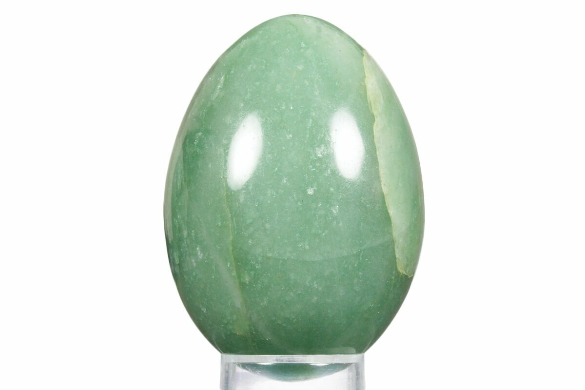This is a beautiful piece of green aventurine from India that has been polished into an egg shape. This egg measures 3.15 inches tall and its glossy polish allows green inclusions to be seen in great detail.