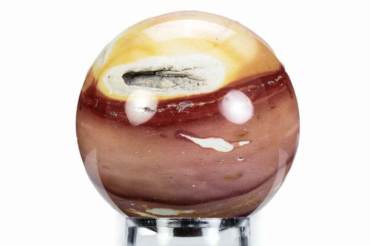 This is a colorful, 3.15" wide mookaite jasper sphere with gorgeous yellow, red, and white coloration. The jasper was collected from Mooka Creek in Western Australia. The polish work on this sphere is second to none.