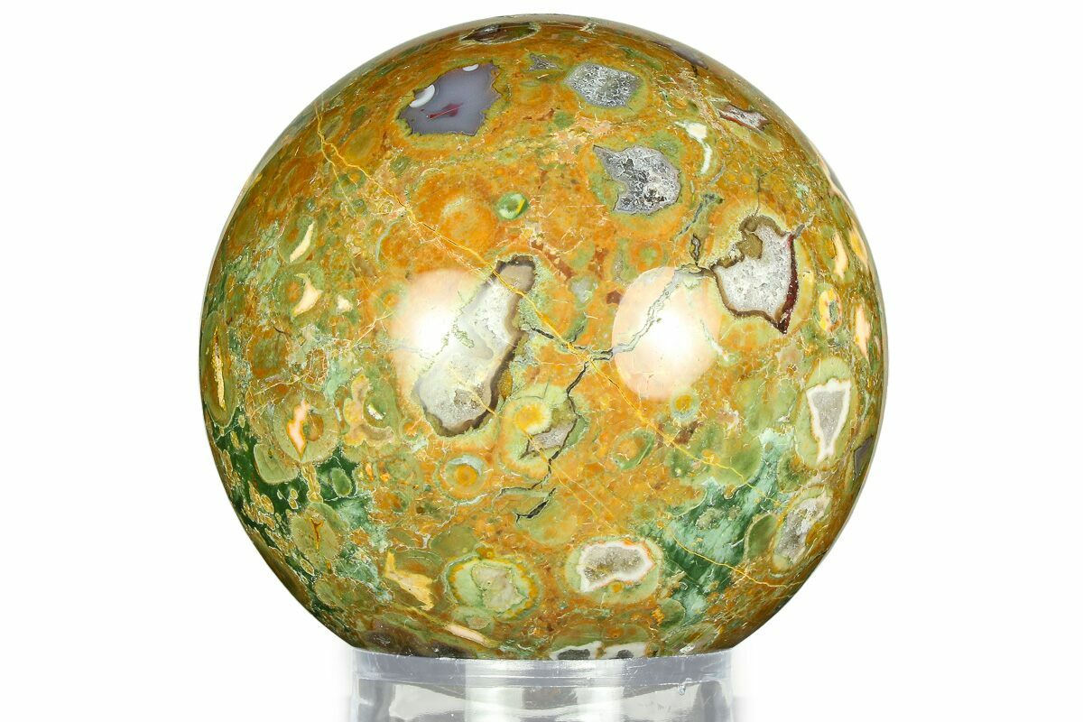 This is a 3.15" wide polished spherulitic rhyolite sphere, collected from Mt. Hay, Queensland. Rhyolite (Rainforest Jasper) is group of extrusive igneous rocks, typically consisting of large-grained crystals such as feldspar or quartz dispersed in a fine-grained silicate rich rock. This type of rhyolite features pockets of agate. Exceptional polish work on this sphere.
