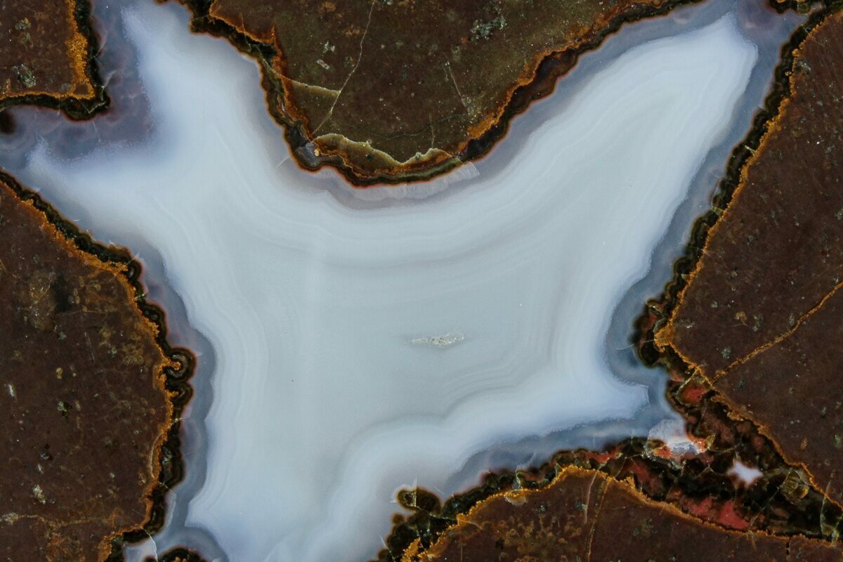 Agate is a variety of microcrystalline quartz (chalcedony) that displays translucence and, in some cases, banding. Agate primarily forms when silica-rich fluids fill pockets within rocks and/or fossils, depositing the silica along the walls of the rock. This process can result in banding patterns, as the compositions and impurities of these depositing fluids change over time. These banding patterns can either form as flat layers, creating linear patterns known as waterline agate, or as rounded layers, forming more common ring-like patterns. These patterns depend on the surfaces available for deposition.