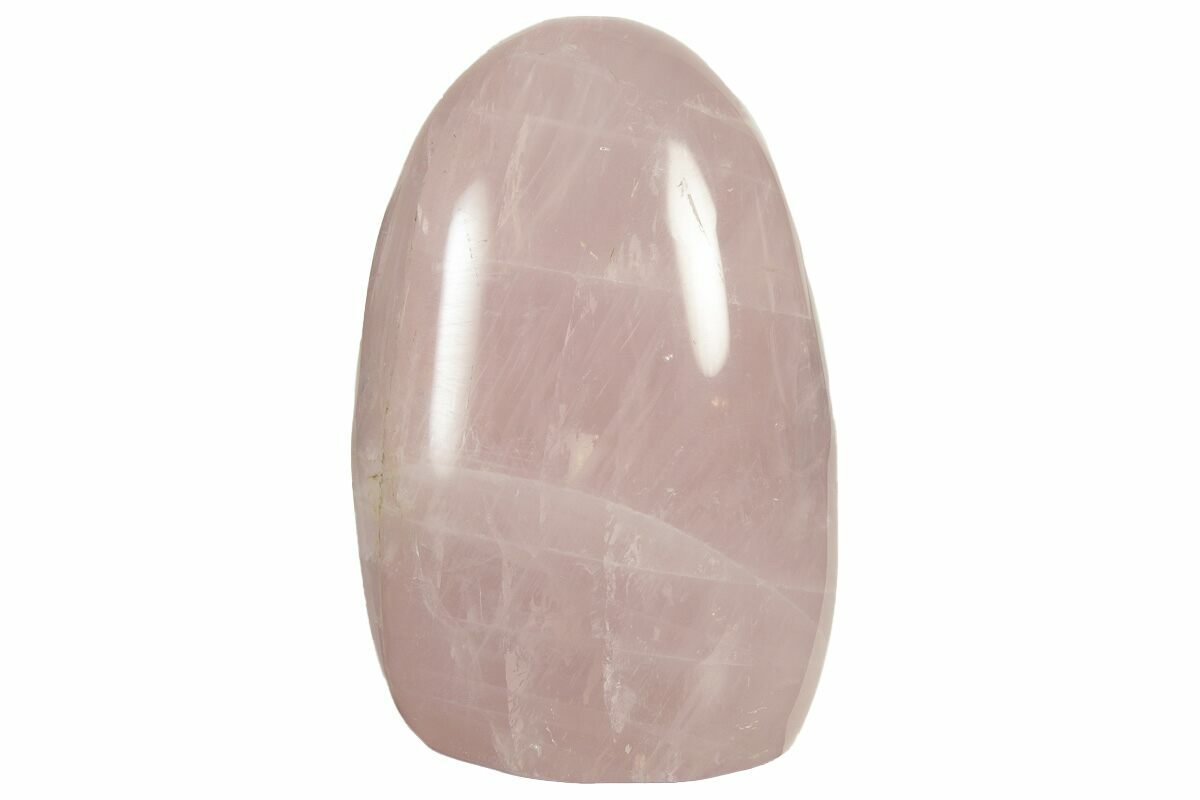This is a 3.2" tall, polished rose quartz freeform from Madagascar. This specimen has been polished into a smooth, free formed sculpture with a cut base to allow for stable display. The rose quartz radiates a beautiful and vibrant pink throughout the entire specimen.