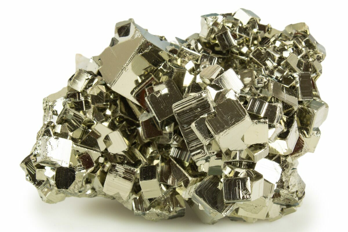 One of pyrite’s defining features is its remarkable diversity of crystal habits—over 20 documented forms—making it one of the most morphologically varied minerals known. It commonly occurs as sharp cubes, octahedra, and pyritohedra, but also forms pentagonal dodecahedra, penetration twins, striated combinations, and complex modified forms prized by collectors. It can develop as massive veins, nodules, botryoidal growths, and fine druzy coatings that shimmer brilliantly under light. Whether glittering in tiny clusters or displayed as perfectly geometric crystals, pyrite showcases an extraordinary range of natural architecture and visual appeal.