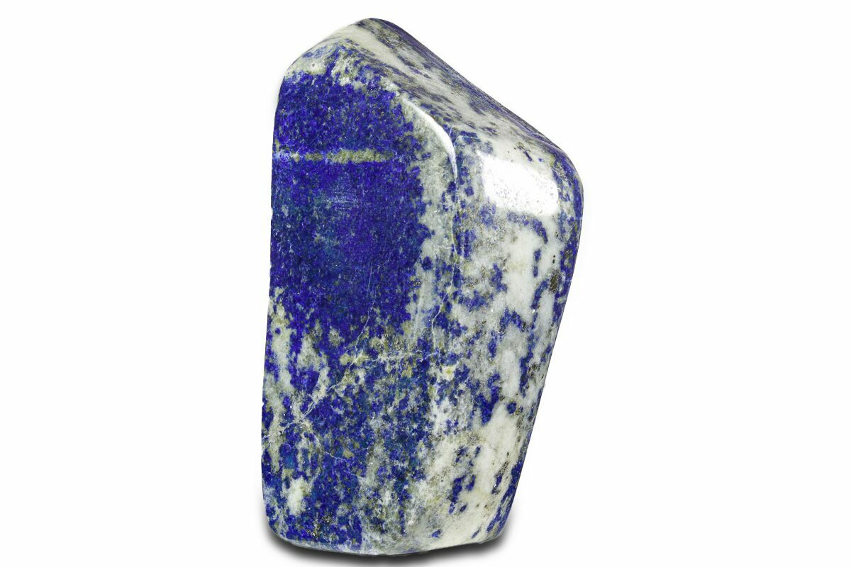 This is a 3.2" wide, polished piece of lapis lazuli with streaks of sparkling pyrite running through it. This vibrant blue stone was mined from northern Pakistan.