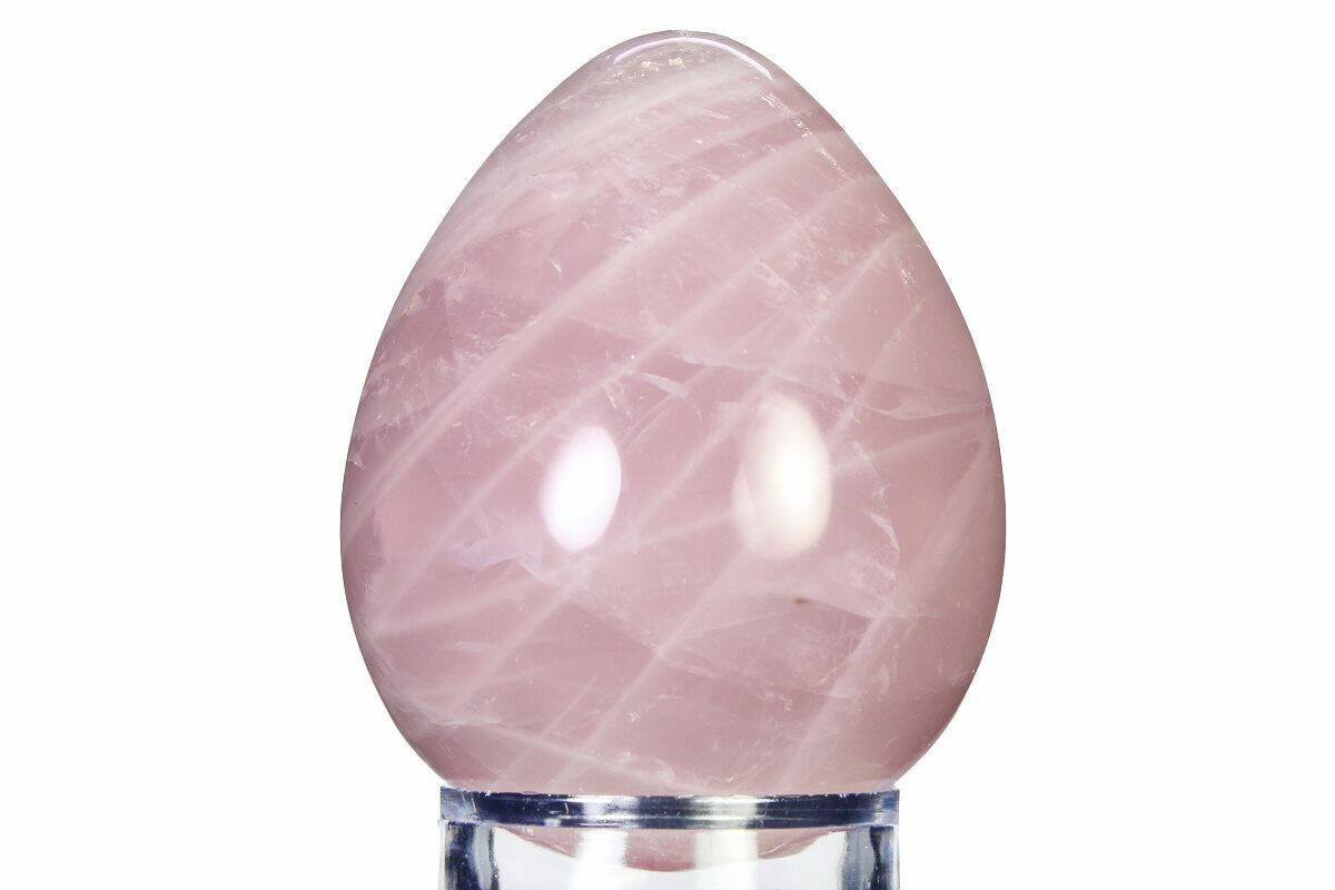 This is a 3.2" tall, polished rose quartz egg from Madagascar. This piece has been polished into a symmetrical egg from a larger chunk of rose quartz. The coloration is vibrant and stunning.