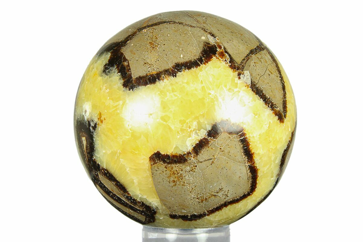 This is a beautiful polished sphere of septarian, deposited during the Jurassic period and collected from the Betsiboka Region of Madagascar. The polishing reveals beautiful patterns of multicolored calcite sections, often creating a reptilian look: hence, septarian is often nicknamed dragon stone!