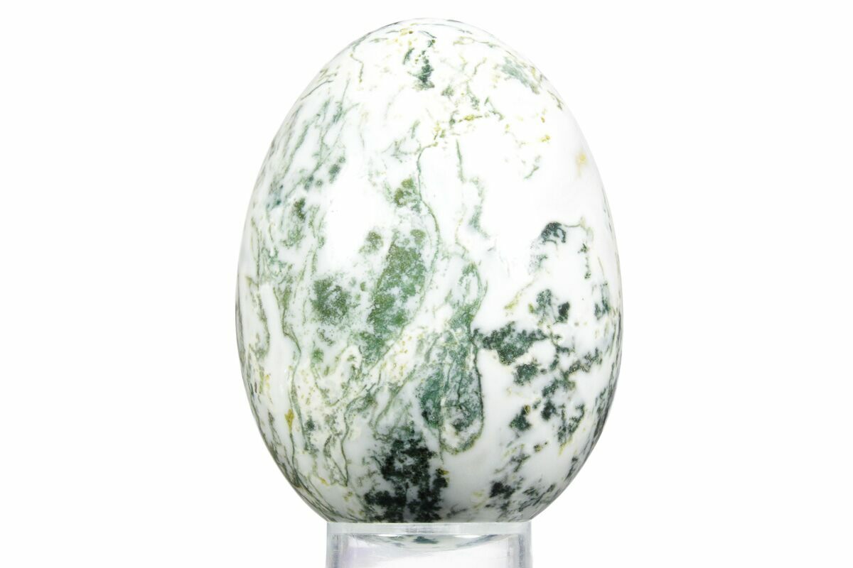 This is a 3.2" tall polished egg that was formed from tree agate. Comes with an acrylic ring display stand.