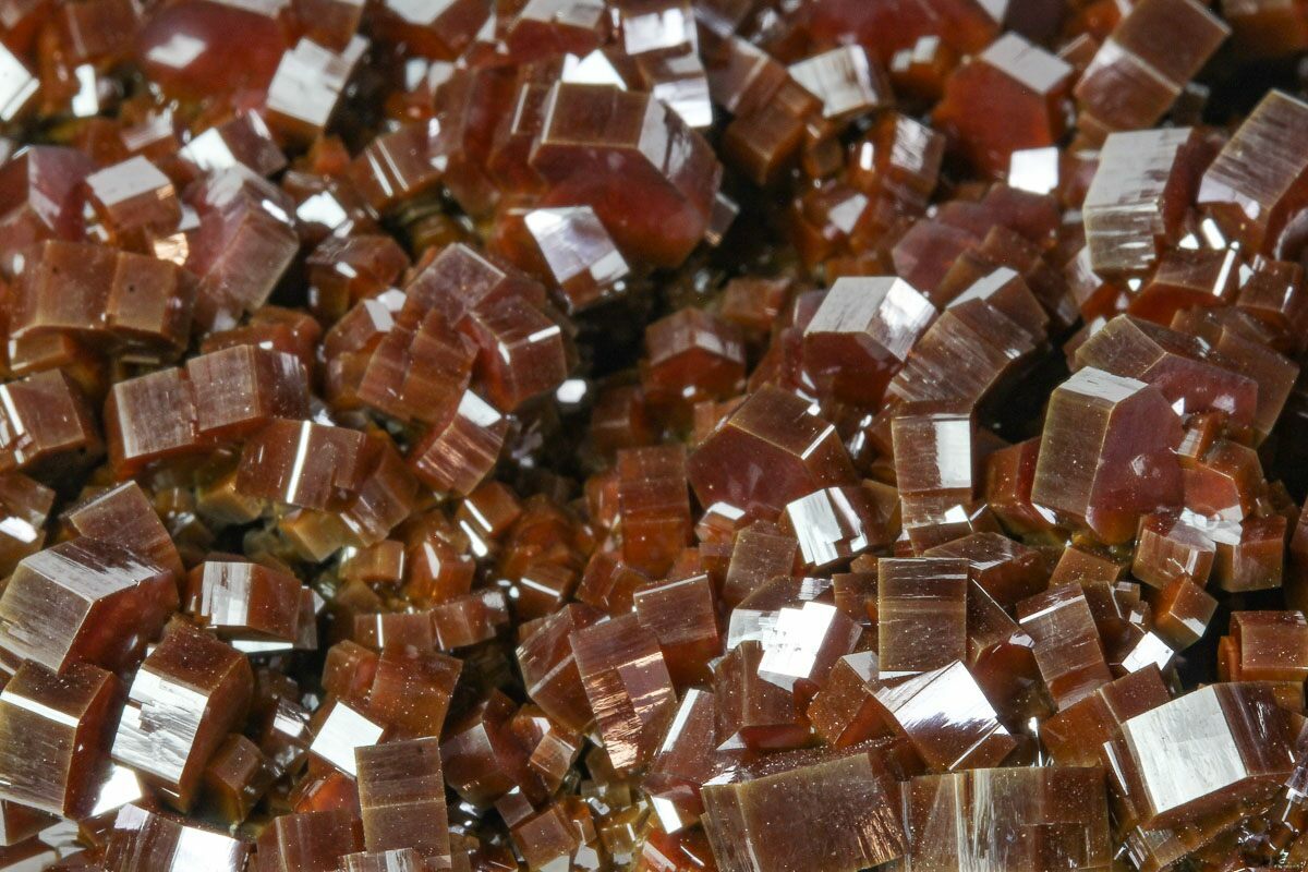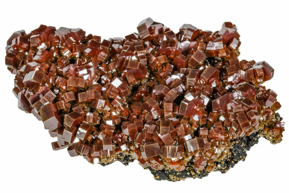 This is a beautiful aggregation of deep red vanadinite crystals from Midelt, Morocco. They exhibit excellent color saturation, and a mirror luster on an iron-rich matrix. This specimen is a cluster of hundreds of both small and medium sized, high quality crystals.