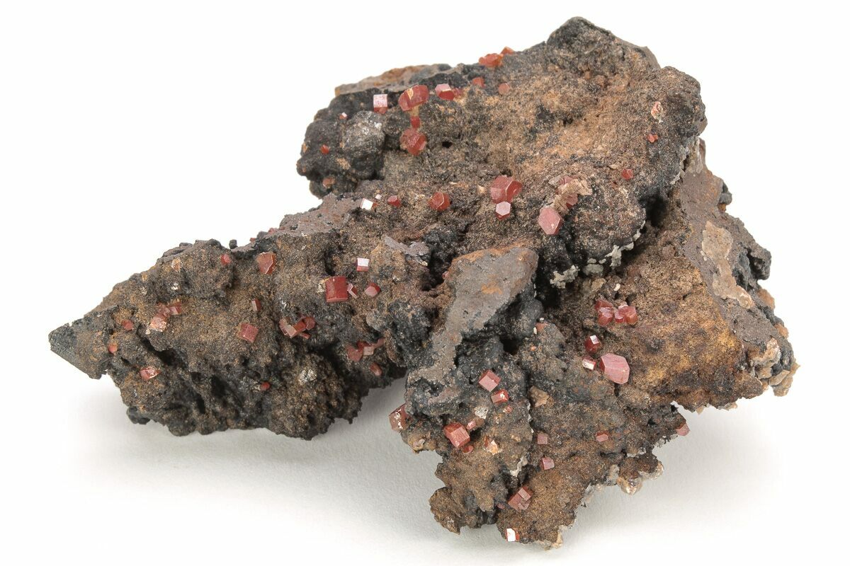 This specimen contains lustrous red Vanadinite crystals, naturally displayed on an iron-manganese oxide matrix. Both iron rich, and manganese rich matrix' can be seen on opposite sides of this specimen.