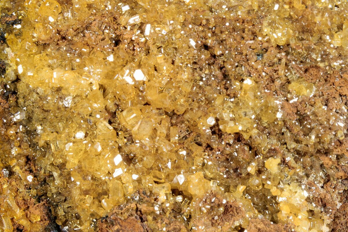 This is a 3.25" wide cluster of lustrous, golden hexagonal mimetite crystals on matrix, collected from the Guatomo Mine ('Hat Yai' mimetite locality) in the Yala Province of Thailand. This abandoned lead-tin mine is located next the Buddhist temple Wat Tham Thalu. The mimetite from this location is old stock material collected between 1996 and 1998.