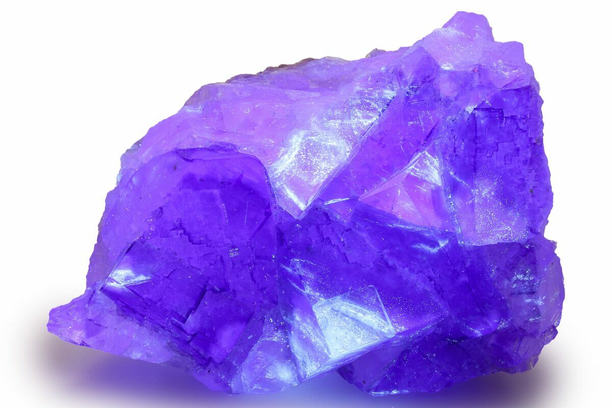 This is a gorgeous purple cubic fluorite crystal cluster from the Cave-In-Rock district of Hardin County, Illinois. The crystals contain multiple bright white phantoms when exposed to short-wave UV light.