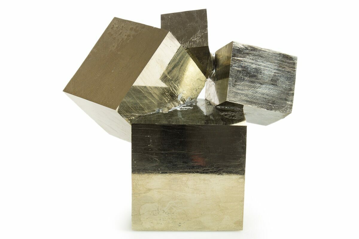 At first glance some people assume that these pyrite cubes are man-made, but the amazing thing is that they are natural! Pyrite from this location is famous for its beautiful shine, near-perfect cubic formation, and sculptural appearance. Because the matrix rock is soft, the cubes often come loose during collection. Care is taken during preparation to stabilize, repair, and make sure everything is remounted in its natural position: no specimens are composites. This means that nearly all of the pyrite cubes still in the rock from this locality have been remounted, and most clusters of multiple cubes have been stabilized.