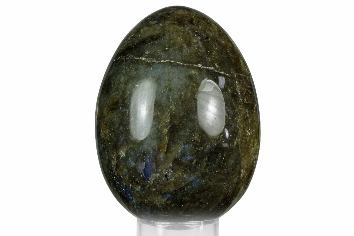 This is a 3.3" tall polished labradorite egg that bursts with flashes of blue, green, and orange when rotated under light. Its shifting color play gives the piece a unique character from every angle.