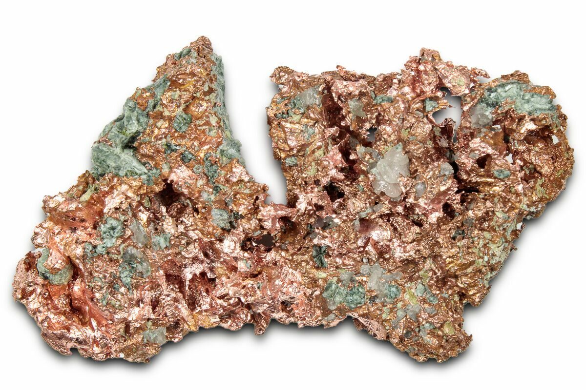 Native copper occurs rarely as isometric cubic and octahedral crystals, but more typically as irregular masses and fracture fillings. It has a reddish, orangish, and/or brownish color on fresh surfaces, but typically is weathered and coated with a green tarnish of copper carbonate.