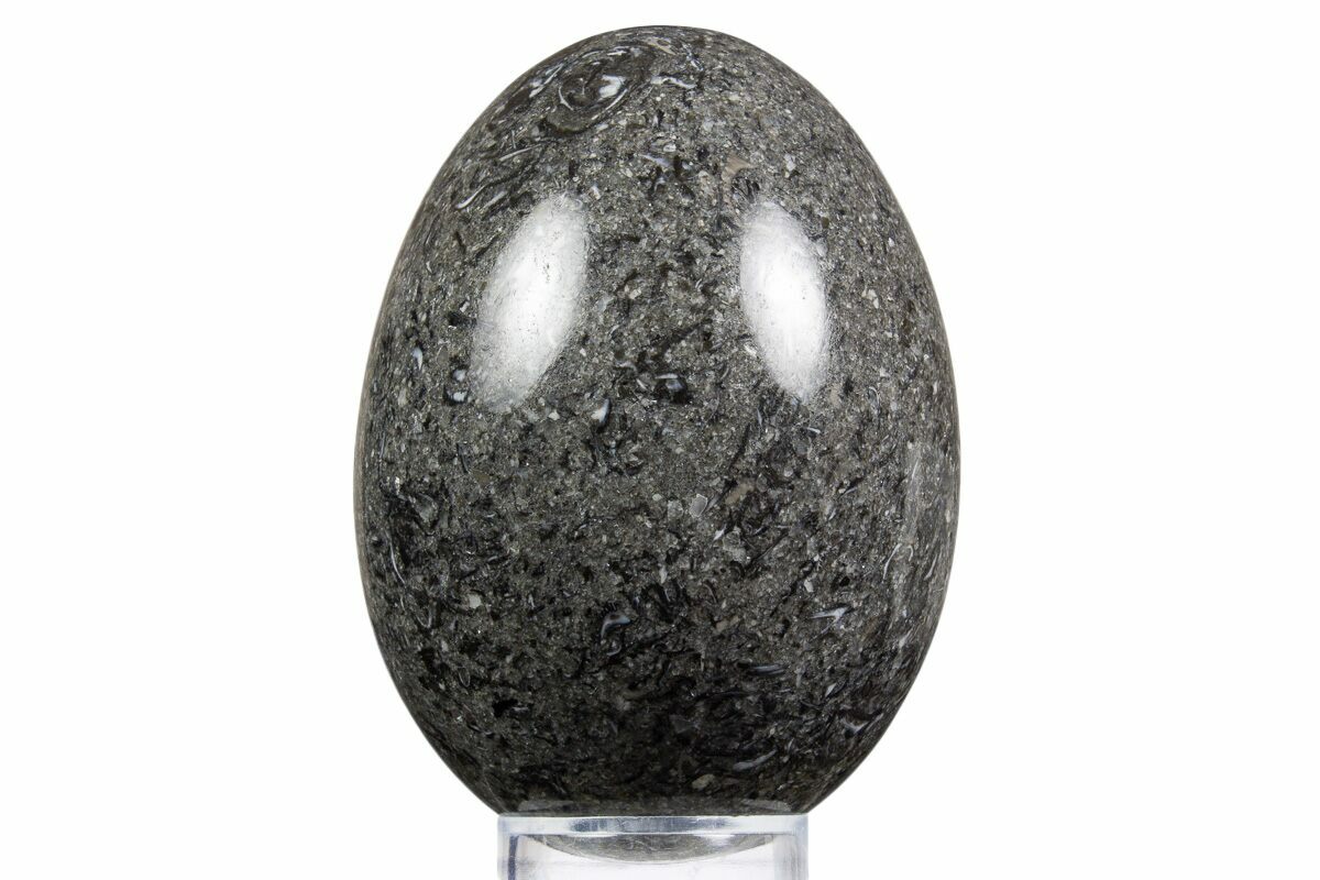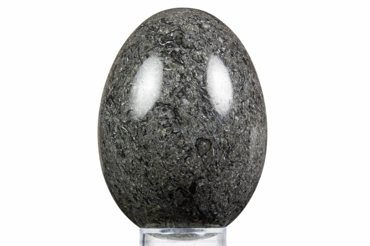 This is a beautiful piece of Coquina from California that has been polished into an egg shape. This specimen measures 3.3 inches tall and has been polished to a glossy finish to highlight the white shell fragment cross sections.