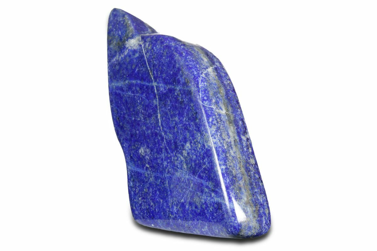 This is a 3.3" wide, polished piece of lapis lazuli with streaks of sparkling pyrite running through it. This vibrant blue stone was mined from northern Pakistan.