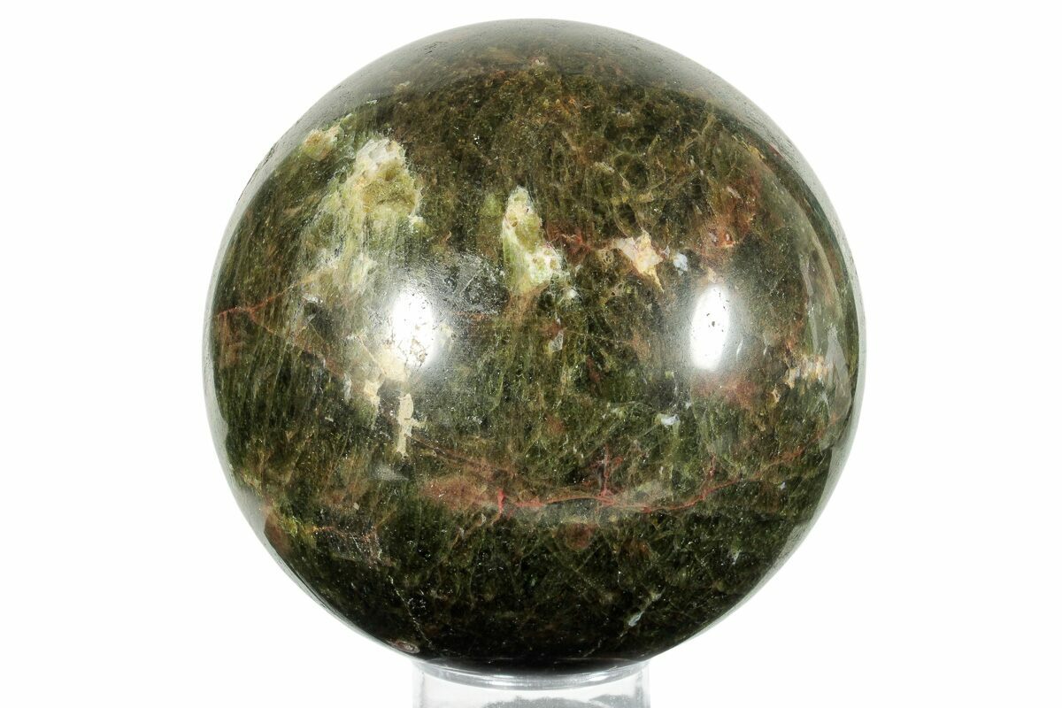 This is a beautiful polished stone sphere made from green apatite, collected from Madagascar. These spheres have a very unique character, created from the great deal of time and energy that goes into forming and then polishing these spheres. This has been sold on the market as green apatite, though we are unable to identify the exact species of this specimen.