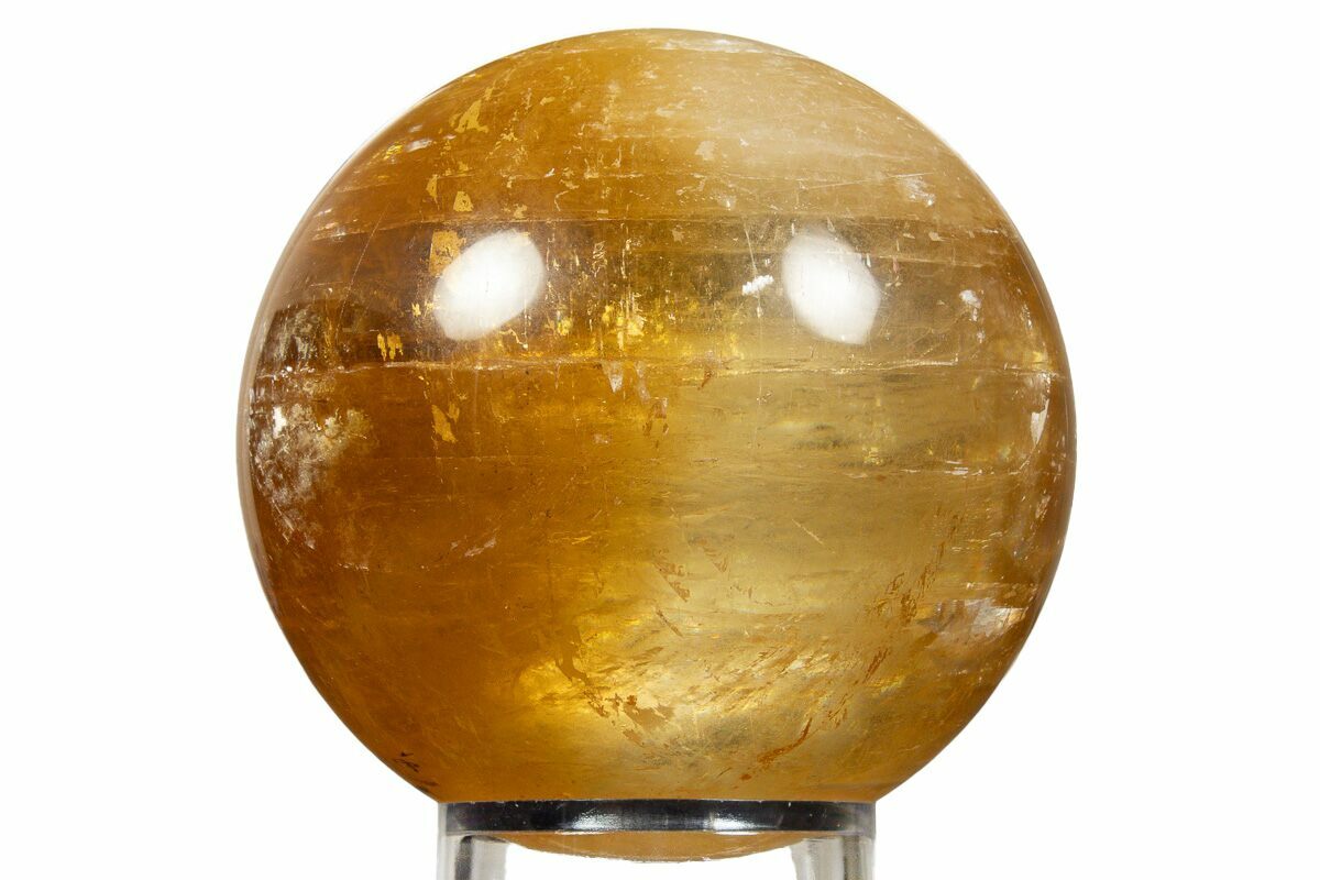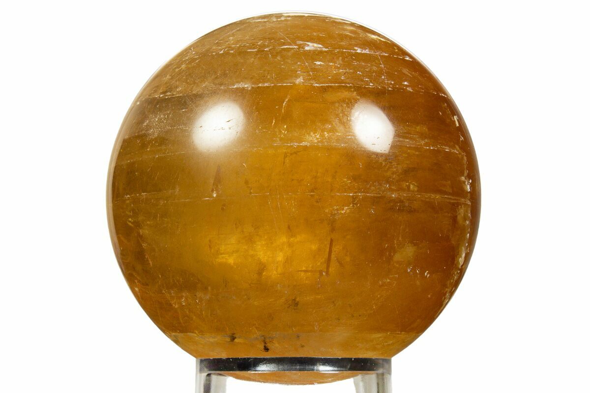 This is a gorgeous, 3.35" wide sphere crafted from a massive formation of honey calcite. The specimen is especially stunning when backlit.