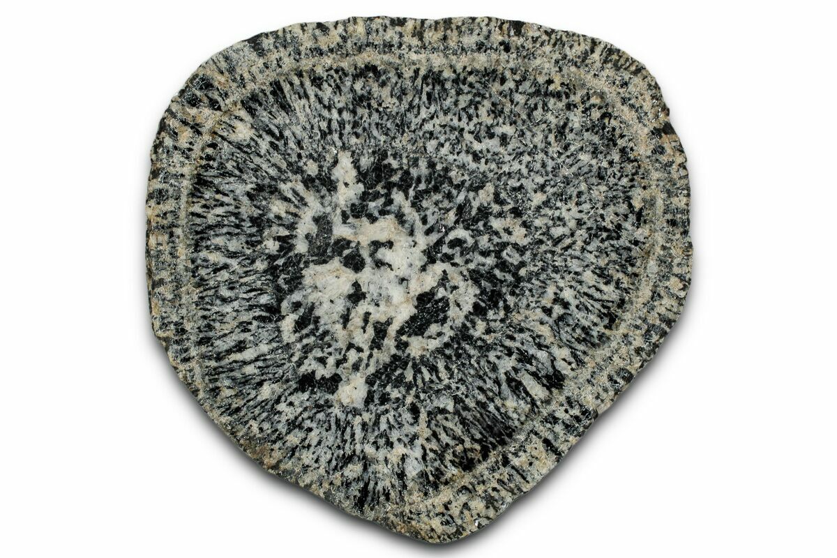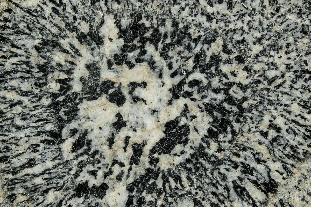 Orbicular granite occurs only rarely, and their occurrences are often very small. Most deposits are found in Finland, but notable deposits can also be found in Chile and Australia. This material is from the Australian Boogardie Orbicular Granite deposit, near Mount Magnet in Western Australia. It is characterized by light andesine with darker hornblende and biotite radiating from plagioclase or hornblende cores. This orbicular granite is touted as the oldest in the world, at almost 2.7 billion years!