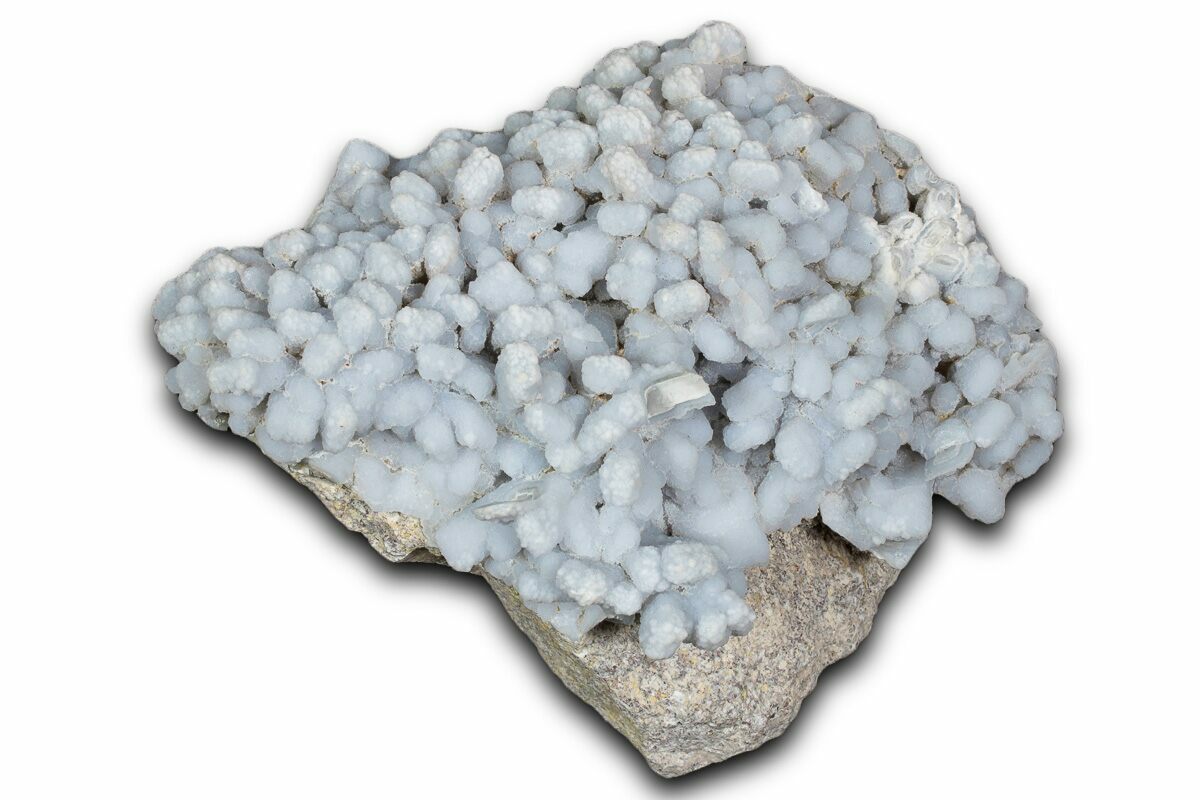 Blue chalcedony after anhydrite from Peru is an unusual silica replacement that preserves the presence of an earlier mineral without retaining its original crystal shape. Originally formed as anhydrite (calcium sulfate), the material was later altered by silica-rich fluids that replaced it with microcrystalline quartz (chalcedony). During this process, the original anhydrite dissolved and the chalcedony grew in smooth, rounded, botryoidal masses rather than angular crystal forms. The resulting specimens display softly contoured surfaces with a waxy to silky luster and calming blue to blue-gray coloration. These pseudomorphs are valued not for sharp geometry, but for their organic textures and as clear examples of mineral replacement—where composition changes completely while the geologic story remains visible.