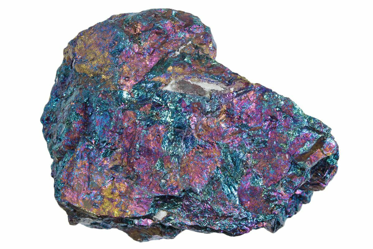 Often called “Peacock Ore” for its vivid, iridescent colors, this material is actually chalcopyrite that has been treated with acid. The treatment replicates a natural process that forms the much rarer copper mineral bornite.