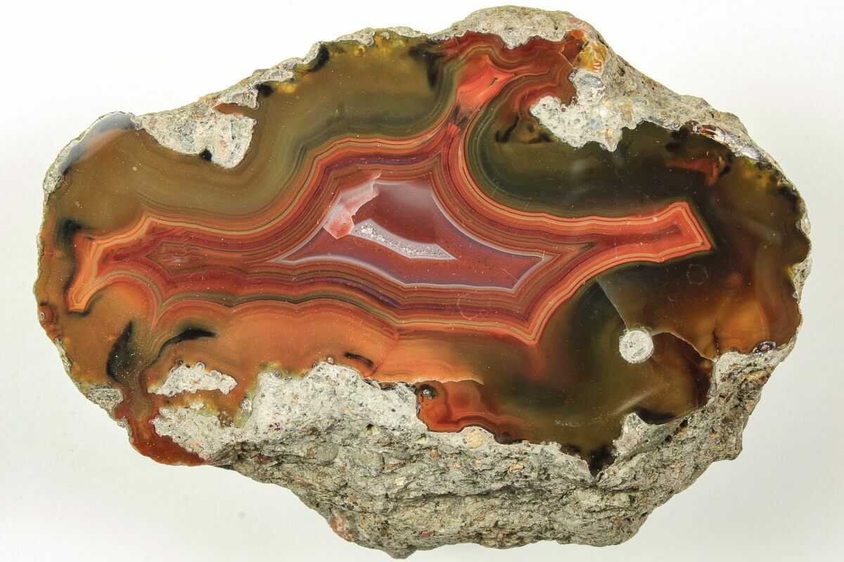 This is a beautiful, 3.4" wide polished nodule of Condor agate from Argentina. It shows off the characteristic red, pink, blue, and yellow coloration in the polished face. It has been cut flat and polished to a glossy finish on one side with the rest of the nodule left in rough form.