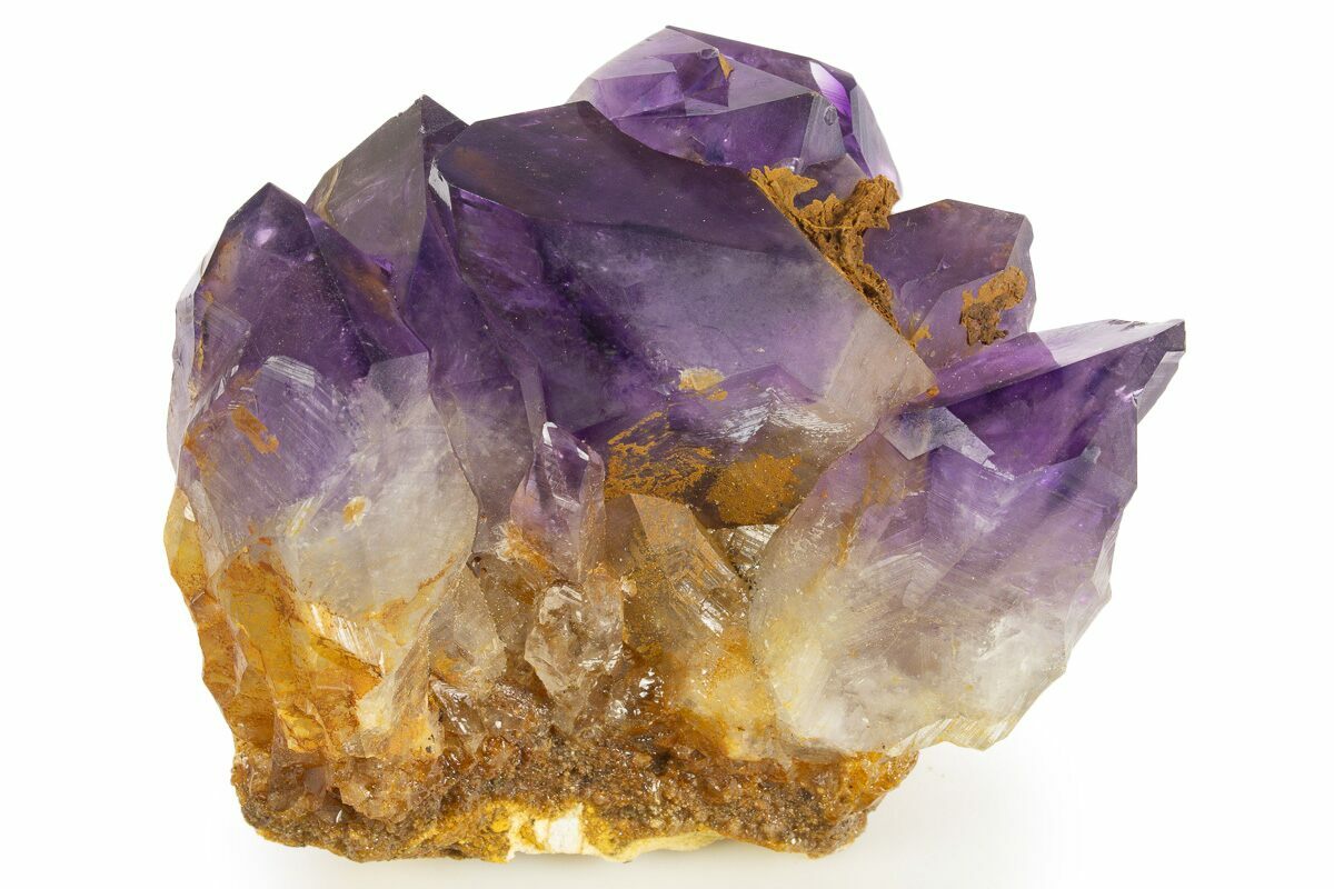 This is a stunning, 3.4" wide amethyst crystal cluster with beautiful purple coloration and exceptional luster, collected from the Democratic Republic of the Congo. These crystals have undergone no color treatment or polishing. The orange-red color across some of the crystals can be attributed to iron oxidation. There is glue stabilization present along the base of the crystals.