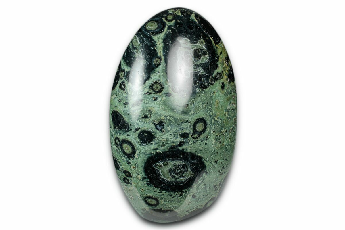 This is a 3.4" tall, polished piece of Kambaba Jasper from Madagascar, shaped so the base sits flat for effortless display on any surface. The stone features the distinctive deep green and black orbicular patterns. A striking addition to any mineral collection or décor setting, it stands beautifully on its own as a natural work of art.