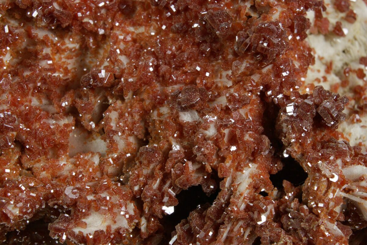 This is a beautiful, 3.4" wide specimen of sparkling, ruby-red vanadinite crystals on a white barite matrix from Mibladen, Morocco. The vanadinite crystals are on the smaller side but cover most of the specimen and exhibit a gorgeous luster.