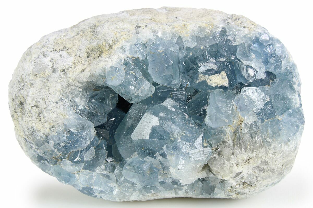 Celestite (or celestine) is a mineral consisting of strontium sulfate (SrSO4). It tends to form attractive, well-shaped crystals that are often found inside of geodes. One of the main sources of celestine is the deposits on the northwestern coast of Madagascar.