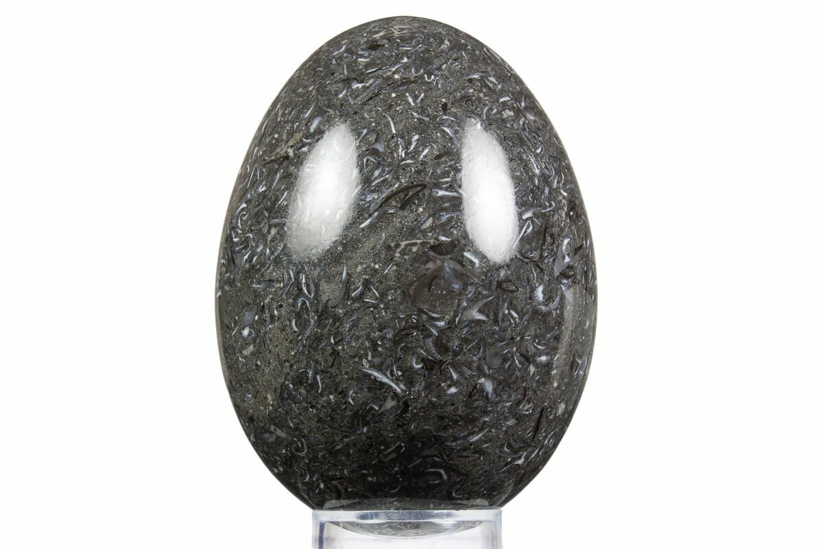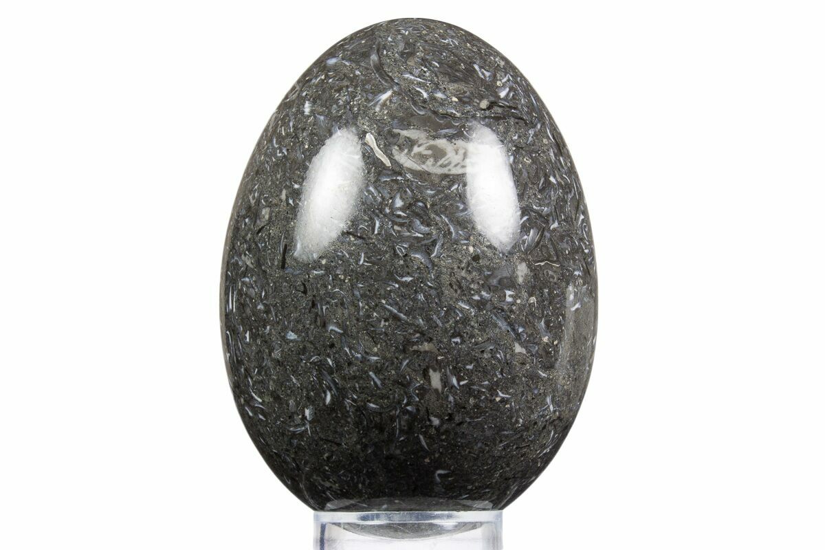 This is a beautiful piece of Coquina from California that has been polished into an egg shape. This specimen measures 3.4 inches tall and has been polished to a glossy finish to highlight the white shell fragment cross sections.