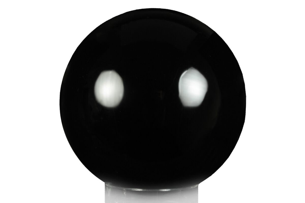 This is a 3.4" wide sphere of obsidian collected in Mexico. The obsidian has been polished expertly to a mirror finish and comes with the pictured display stand.