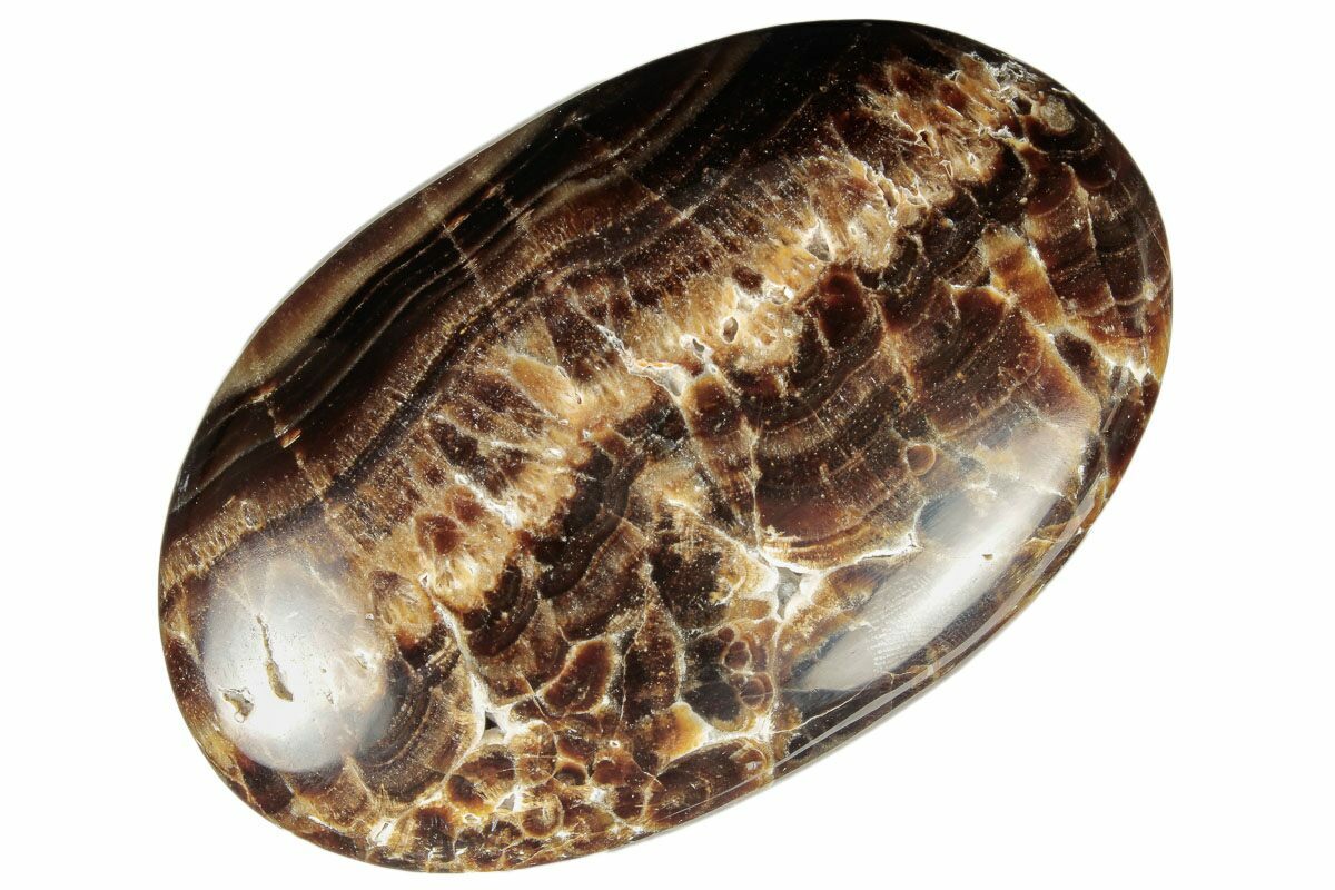 This is a beautiful, 3.4" wide polished palm stone that was formed from "chocolate calcite", collected from Pakistan. This specimen features alternating bands of white, beige and brown calcite, and has been polished to a glossy finish.