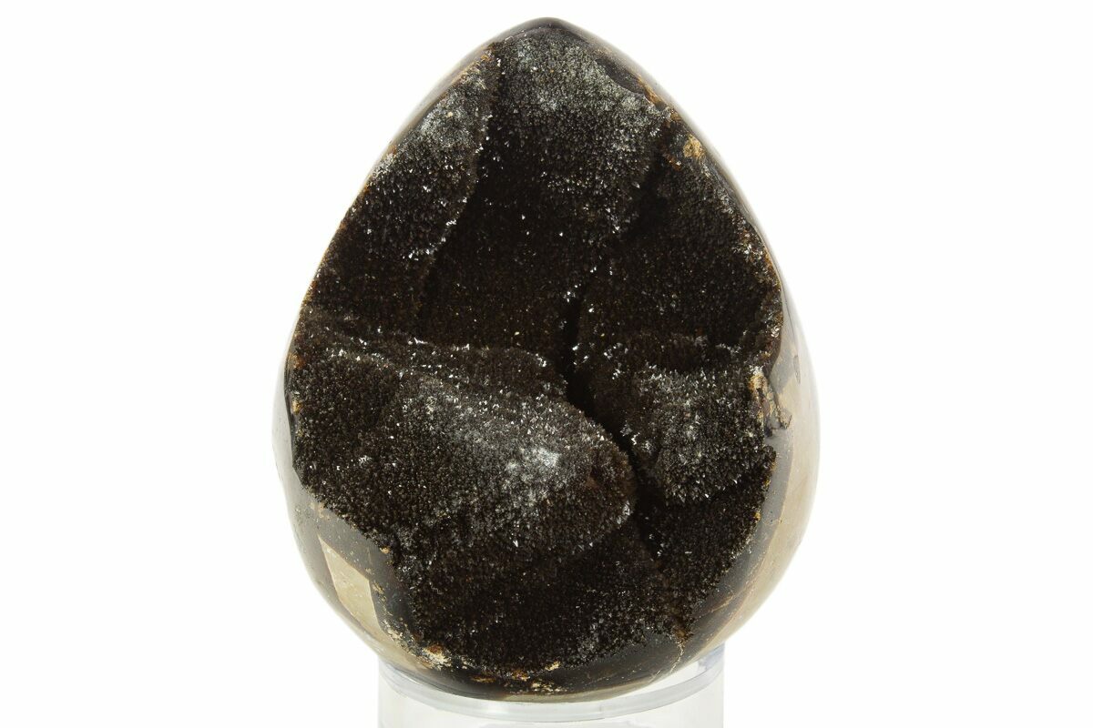 This is a gorgeous septarian "dragon egg" geode collected in the Betsiboka Region of Madagascar. The hollow cavity is full of beautiful, sparkling black & brown calcite crystals. It is a hollow septarian nodule which has been polished into an egg shape, and the natural cracked pattern of the septarian gives it the appearance of a dragons egg. A spectacular display piece which would look great in your home/office or make a great gift for the Game of Thrones enthusiast you know.