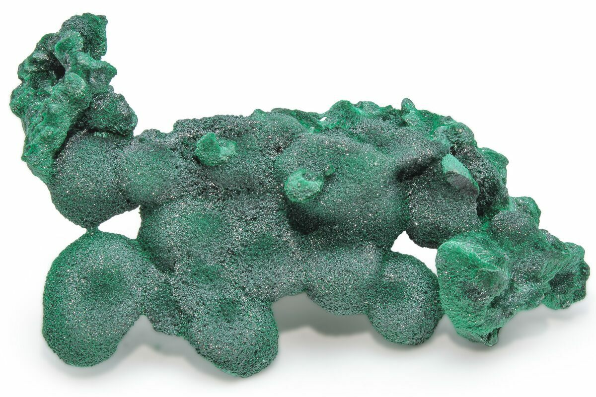 Malachite is an intense green copper-based mineral that can be found in a wide variety of forms. Malachite can grow in botryoidal masses, stalactitic formations, and reniform formations, typically as a tight cluster of fanning fibrous needles that make up a seemingly solid mass. As layers continue to stack during formation, banded patterns can sometimes begin to take shape, explaining the rings in all shades of green seen on most polished malachite specimens.