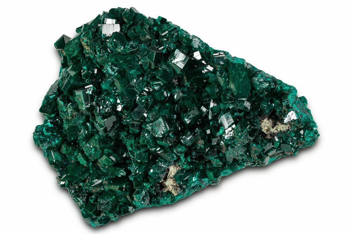 This is a sparkly 3.4" wide cluster of vibrant, emerald-green dioptase crystals mined in the Congo. The specimen features sharply terminated, glassy crystals with exceptional translucency and the intense, saturated green color that has made Congolese dioptase one of the world’s most coveted copper silicates.