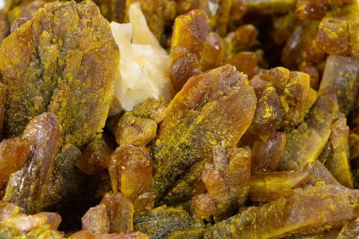 Orpiment is a bright orange to yellow arsenic sulfide mineral. Its name is derived from the latin phrase auripigmentum, meaning “gold pigment”. It is frequently found as a decay byproduct and in association with another arsenic mineral, realgar. Orpiment crystals are commonly found in dense groupings containing small, prismatic crystals, often with chisel-shaped or triangular pyramidal terminations.
