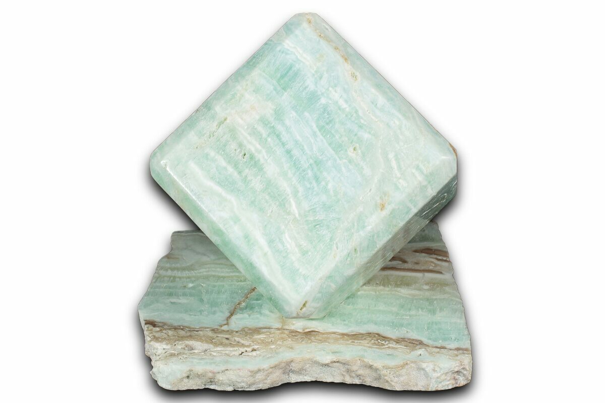 This is a 2.25" wide, polished cube of blue Caribbean calcite collected from the Balochistan Province along the border of Pakistan and Afghanistan. It has been cut into the shape of a cube with beveled edges and polished to a glossy finish. One corner has been cut flat for an aesthetic "floating" presentation on the accompanied Caribbean calcite base.
