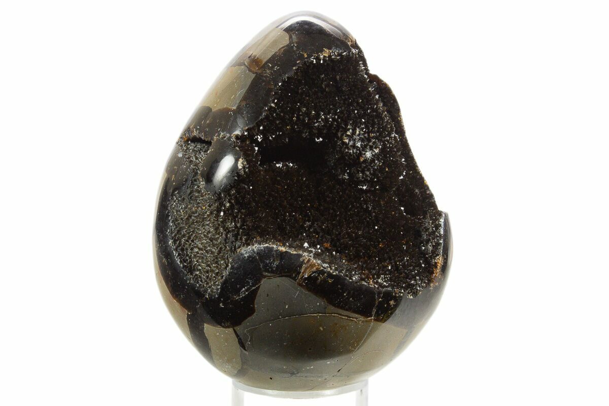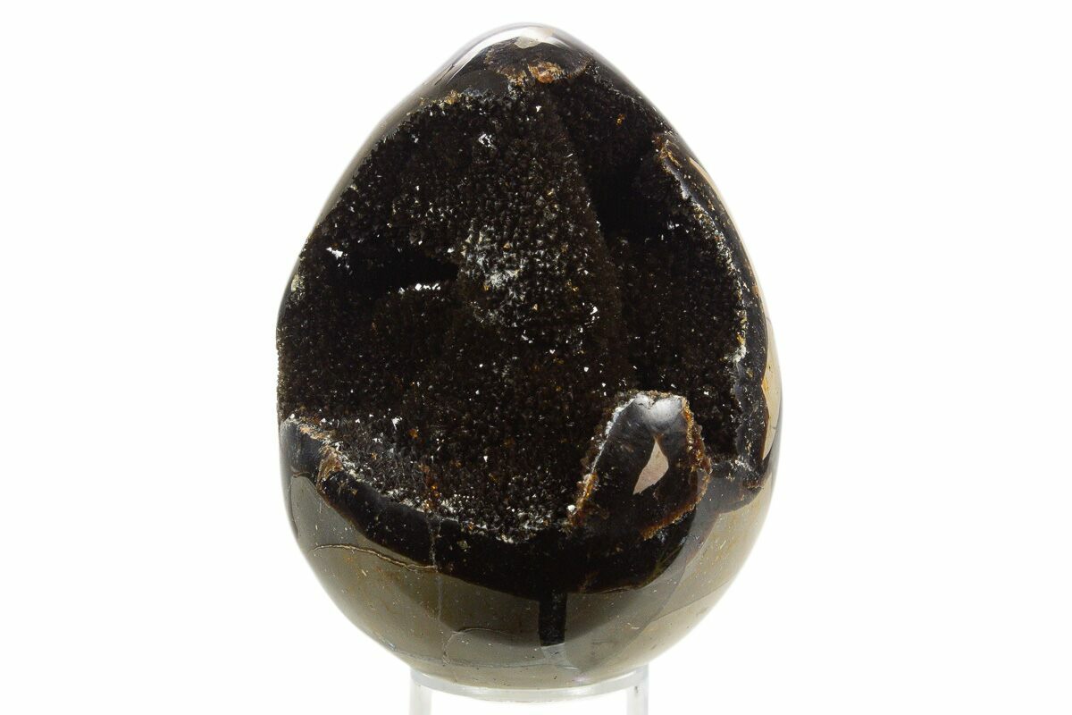 This is a gorgeous septarian "dragon egg" geode collected in the Betsiboka Region of Madagascar. The hollow cavity is full of beautiful, sparkling black & brown calcite crystals. It is a hollow septarian nodule which has been polished into an egg shape, and the natural cracked pattern of the septarian gives it the appearance of a dragons egg. A spectacular display piece which would look great in your home/office or make a great gift for the Game of Thrones enthusiast you know.