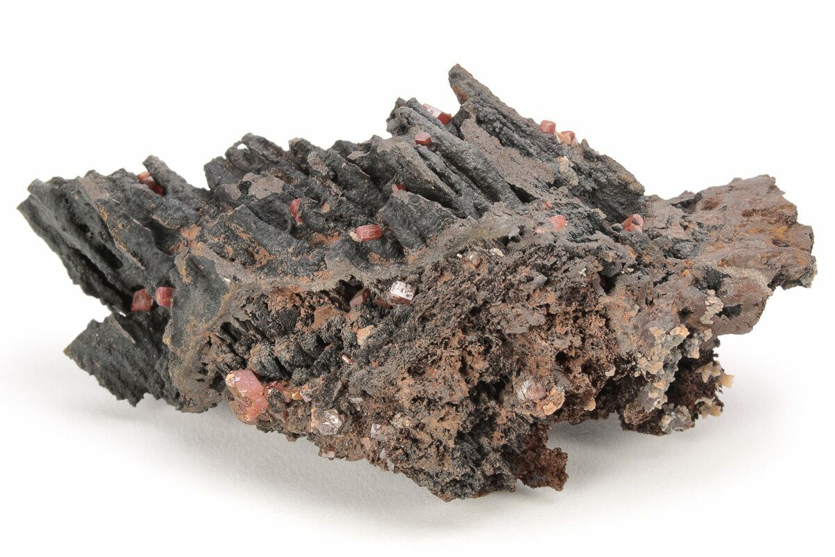 This specimen contains lustrous red Vanadinite crystals, naturally displayed on an iron-manganese oxide matrix. Both iron rich, and manganese rich matrix' can be seen on opposite sides of this specimen.