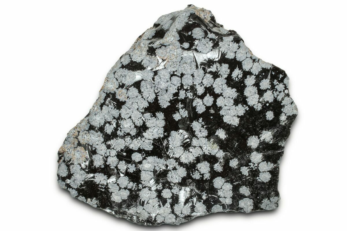 Snowflake obsidian is found near Sevier Lake in Millard County, Utah. It is a natural volcanic "glass" that forms when molten rock cools so quickly that that atoms do not have enough time to arrange themselves into crystals. Instead, the molten material solidifies into an amorphous solid called a glass. The "snowflakes" in the obsidian are small, white, radially clustered crystals of cristobalite, a mineral polymorph of silica.
