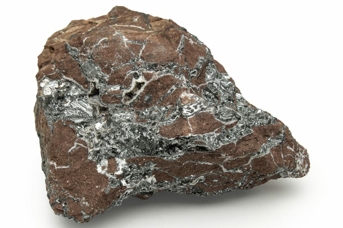 This is a lustrous formation of radiating silver pyrolusite from Morocco. The specimen features several radiating sprays of shiny, metallic crystals in a red-brown, iron-rich matrix.