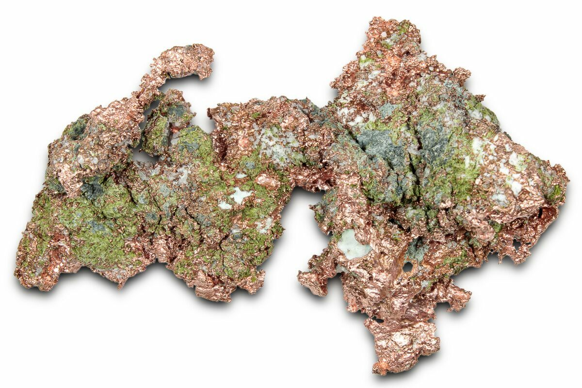 Native copper occurs rarely as isometric cubic and octahedral crystals, but more typically as irregular masses and fracture fillings. It has a reddish, orangish, and/or brownish color on fresh surfaces, but typically is weathered and coated with a green tarnish of copper carbonate.