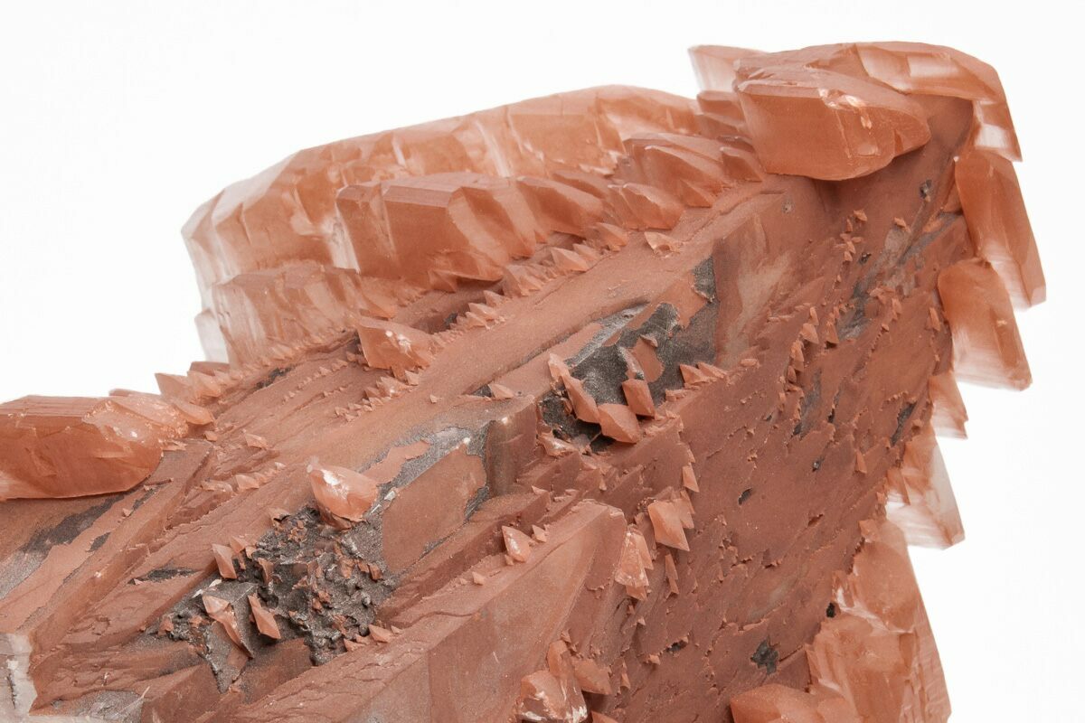 This is a beautiful cluster of hematite included, "pagoda style" calcite crystals that formed after a large, hematite encrusted dogtooth (scalenohedral) calcite crystal. This specimen was collected from the Fengjiashan Mine in Hubei, China. Under short-wave ultraviolet, the colorless portions of the calcite react by fluorescing orange in color.