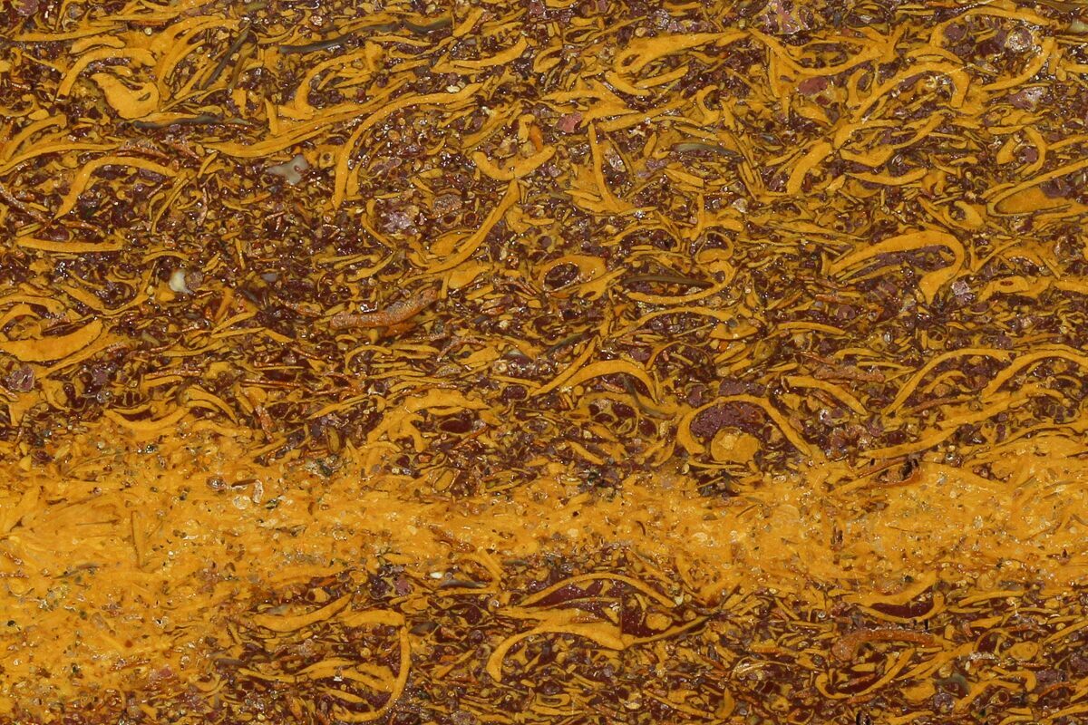 This is a beautiful, 3.5" wide polished slab of coquina jasper from the Himalayan Mountains of India. The polishing is wonderful, with no dull spots or scuff marks. An absolutely interesting and gorgeous piece. It comes with an acrylic display stand.
