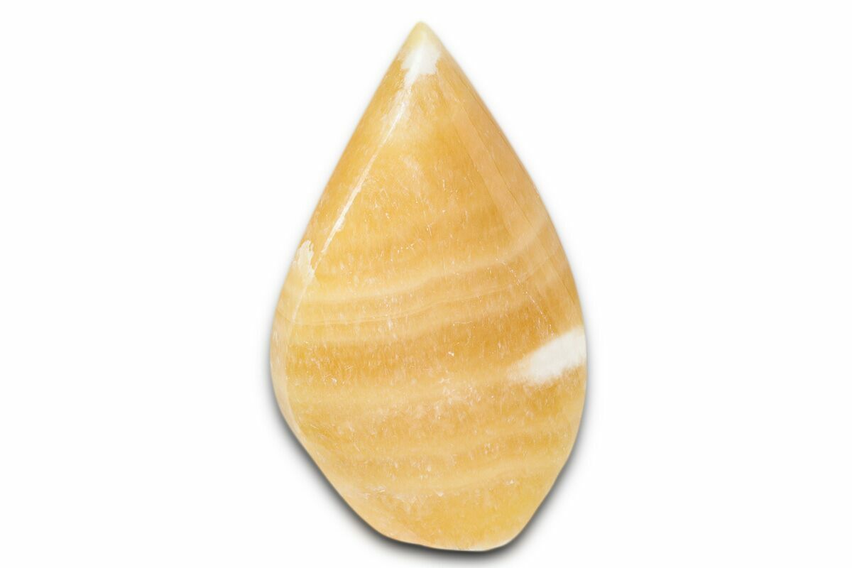 This is a 3.5" tall polished flame made from orange (mango) calcite collected from Afghanistan. The entire specimen has been polished to a glossy finish and the base of the stone has been cut flat so that it displays nicely on a hard surface.