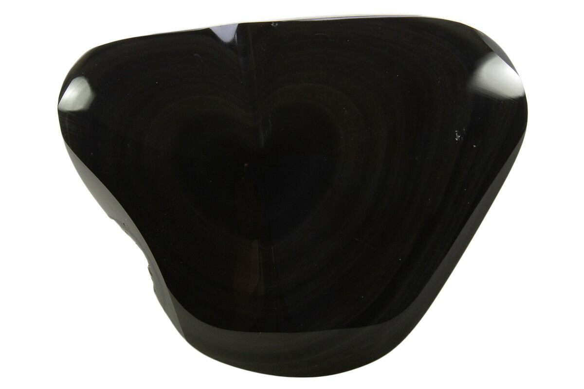 This is a 3.5" wide rainbow obsidian specimen. This interesting stone is mined from La Revoltosa Mine near San Andreas, Jalisco, Mexico. The obsidian exhibits a colorful chatoyant effect that changes when viewed under a light source from different angles. The specific shaping and polishing of the obsidian gives the rainbow layers their heart shape.